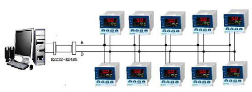 使用RS232-RS485轉(zhuǎn)換器可以很方便的連接計算機和10臺AI-501。具體方案如圖1。RS232-RS485轉(zhuǎn)換器的RS232端接到計算機,所有儀表并聯(lián)在RS485的A、B端,并設(shè)置不同的地址。我設(shè)置的10臺AI-501地址分別是:1,2,3,4,5,6,7,8,9,10。