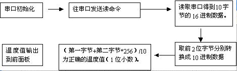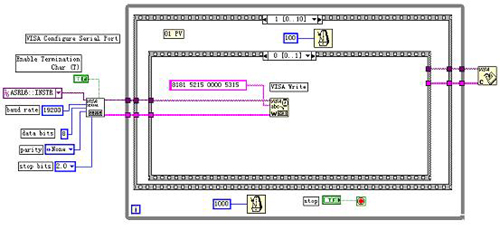 本程序的圖形代碼窗口如圖4.1和4.2。在圖形代碼窗口,為了完成對串口的初始化、寫和讀,分別用到串口初始化函數(shù)(VISA Configure Serial Port)、串口寫函數(shù)(VISA Write)和串口讀函數(shù)(VISA Read)。另外,由于得到的數(shù)據(jù)為16進制,還用到了一些字節(jié)處理函數(shù),使之換算成10進制顯示在程序前面板。