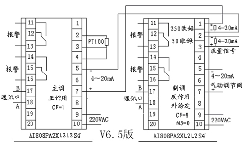 正確接線(圖二),注意信號(hào)方向,設(shè)置參數(shù):副調(diào):AI-808AXL2、流量量程標(biāo)度1.60T/h、設(shè)定值0.80T/h(系統(tǒng)正常運(yùn)行時(shí)的流量值)。dF=2、Ctrl=1、Ct1=1、Sn=32、dIP=2、dIL=0、dIH=1.60T/h、OPI=4、CF=8(反作用、外給定功能)、dL=2、可設(shè)置正、負(fù)偏差報(bào)警。主調(diào):AI-808AXL2、傳感器熱電阻,設(shè)定值40℃、Ctrl=1,dF=0.2、Ct1=4、Sn=21、dIP=1、OPI=4、CF=1(正作用)、dL=2、可設(shè)置上、下限報(bào)警、正、負(fù)偏差報(bào)警。(圖二)