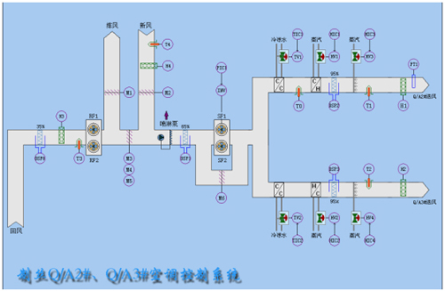 在上位監(jiān)控微機(jī)上顯示中央空調(diào)的整個(gè)工作狀態(tài),如工藝流程圖、動(dòng)畫構(gòu)件、空氣流動(dòng)塊、過程參數(shù)、安紐設(shè)置。