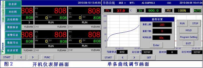 1、數(shù)據(jù)采集及控制:軟件系統(tǒng)從工業(yè)現(xiàn)場溫度控制器采集測量值,編輯實(shí)時(shí)曲線,可同時(shí)顯示8條實(shí)時(shí)曲線,用顏色來區(qū)別。曲線顯示可選百分比與實(shí)時(shí)曲線2種圖。也可屏蔽其他曲線,顯示單條曲線。呈現(xiàn)的實(shí)時(shí)數(shù)據(jù),并存入系統(tǒng)內(nèi)數(shù)據(jù)庫,以便日后數(shù)據(jù)查詢等使用。在流程圖、實(shí)時(shí)趨勢圖或儀表畫面上: