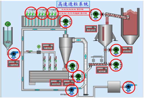 在某高速造粒監(jiān)控系統(tǒng)中使用了2臺AI-301ME5I5I5I5I5I5S來采集顯示12個開關量輸入點,主要是各種風機和電磁閥的狀態(tài)。
